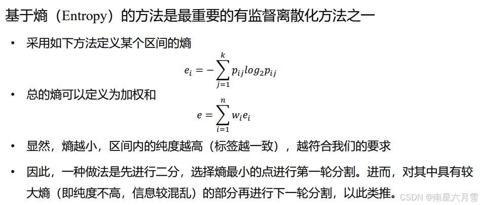 - 核心思想:最小化离散化后所有区间的标签熵之和,即让每个区间的标签分布尽可能纯净。