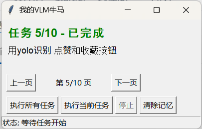 AI响应: 根据当前屏幕截图分析,任务5/10"用yolo识别点赞和收藏按钮"已经完成。点赞和收藏按钮已被成功识别并点击,相关操作已执行完毕。