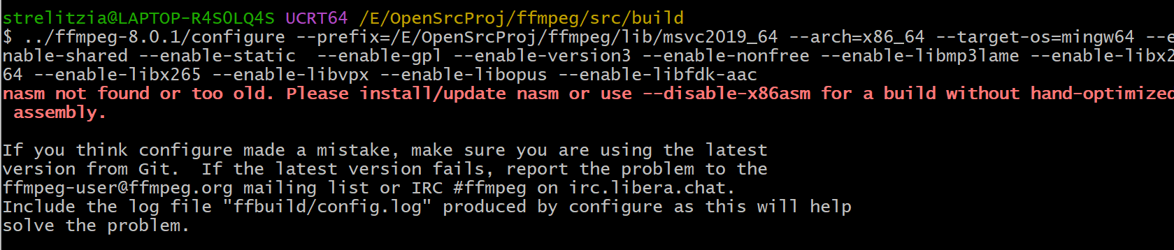将上面的 --toolchain=msvc 移除,让configure自动使用MinGW的gcc。再次运行,报错如下图所示。因为 NASM 没有安装,或者版本太低。FFmpeg 依赖 NASM(Netwide Assembler) 编译关键的性能优化代码(x86 汇编部分)。
