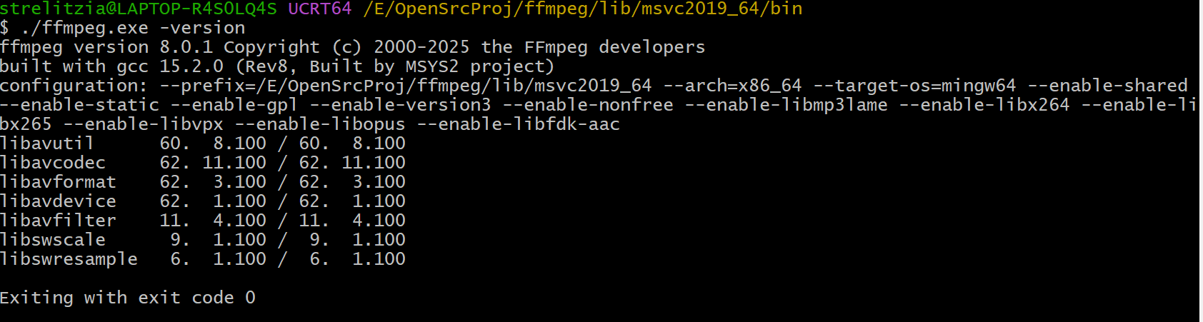 ../ffmpeg-8.0.1/configure --prefix=/E/OpenSrcProj/ffmpeg/lib/msvc2019_64 --arch=x86_64 --target-os=mingw64 --toolchain=msvc --enable-shared --enable-static --enable-gpl --enable-version3 --enable-nonfree --enable-libmp3lame --enable-libx264 --enable-libx265 --enable-libvpx --enable-libopus --enable-libfdk-aac