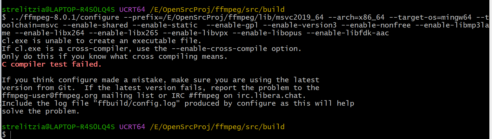 工具链错配:--toolchain=msvc 告诉 FFmpeg 去寻找并使用 Visual Studio 的 MSVC 编译器(cl.exe, link.exe)。但在 MSYS2 UCRT64 环境中,默认的、可用的编译器是 MinGW-w64 的 GCC。MSYS2 环境通常没有、也不直接兼容 MSVC 的命令行工具。