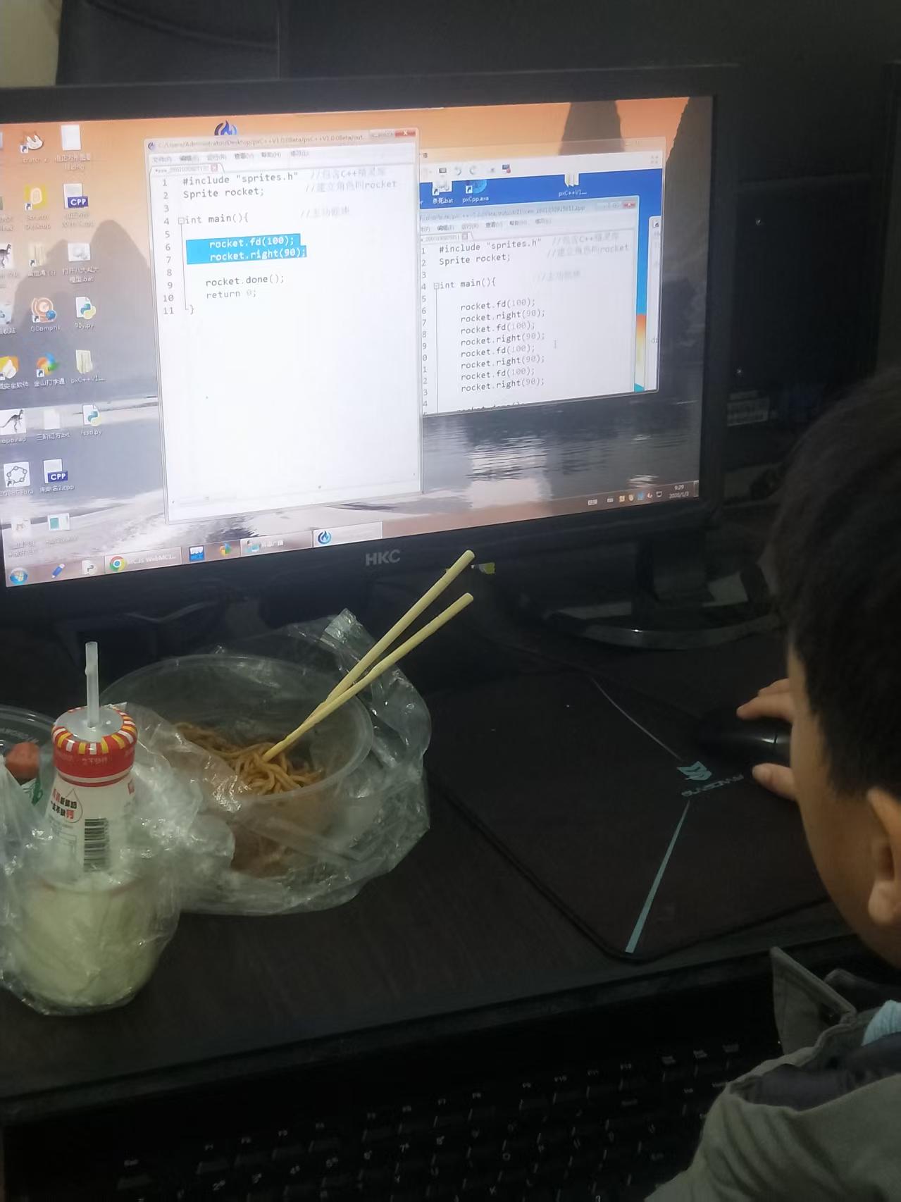 C++精灵库的默认角色是小火箭,孩子们用小火箭在星空挥舞着画笔,画出漂亮的图案。今天我们用它正式进行了教学。这些孩子最小三年级,最大五年级。它们都学过Python编程二期以上,所以看到这个C++代码,都感觉C++比较容易。以下是就他们这次上课学习的C++代码:
