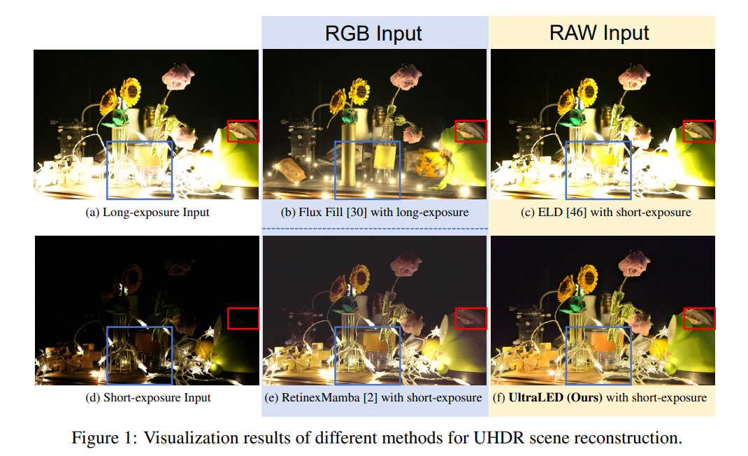 超高动态范围(UHDR)场景在明亮区域和黑暗区域之间表现出显著的曝光差异。这种情况在有光源的夜间场景中很常见。即使使用标准曝光设置,也常常会出现具有边界峰值的双峰强度分布,这使得同时保留高光和阴影细节变得困难。基于RGB的包围曝光方法可以通过长短曝光对捕捉两端的细节,但容易出现错位和重影伪影。我们发现,短曝光图像已经保留了足够的高光细节。超高动态范围(UHDR)重建的主要挑战在于降噪和恢复暗部区域的信息。与RGB图像相比,RAW图像由于其更高的位深度和更可预测的噪声特性,在应对这一挑战方面具有更大的潜力。这就引出了一个关键问题:我们能否仅通过一张短曝光的RAW图像,就学会看清超高动态范围(UHDR)场景中的所有事物?在本研究中,我们仅依赖单张短曝光帧,这从本质上避免了重影和运动模糊,使其在动态场景中尤为稳健。为实现这一目标,我们提出了UltraLED------一种两阶段框架,该框架首先通过比率图进行曝光校正以平衡动态范围,然后借助亮度感知的RAW降噪器增强暗部区域的细节恢复。为了支持这一设置,我们设计了一个9档曝光pipline来合成逼真的超高动态范围(UHDR)图像,并基于多样化的场景构建了相应的数据集,该数据集仅使用最短曝光作为重建输入。大量实验表明,UltraLED 显著优于现有的单帧方法。