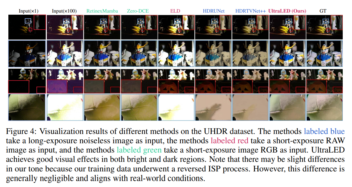 尽管UltraLED在超高清动态范围(UHDR)场景中的表现显著优于RGB域方法,但它与RAW降噪方法[46, 52, 21]存在一个共同的局限性:噪声模型对相机特定参数有很强的依赖性。为了更直观地说明这一点,我们在使用索尼A7M4相机拍摄的UHDR数据集上,测试了不同相机运用其各自噪声参数时的性能。表6中的结果表明,噪声参数不准确所带来的影响会随着噪声强度的增加而增大。因此,对于不同类型的相机,需要使用针对该类型相机专门校准的噪声参数来重新训练模型。