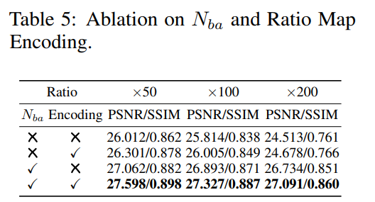 表5说明了亮度感知噪声和比率图编码的有效性。