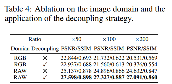 表4说明解耦策略在RGB域中效果不大,在RAW域中表现较好,RAW域效果要显著优于RGB域