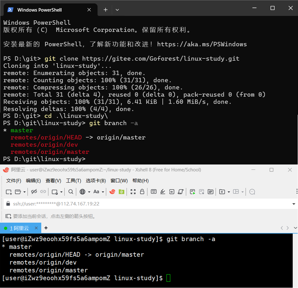 [user@iZwz9eoohx59fs5a6ampomZ linux-study]$ git branch -a