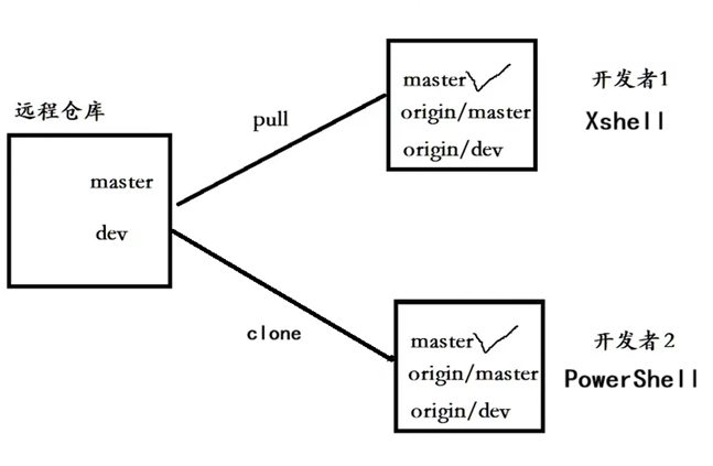 (1)先链接在远程仓库和两个本地仓库的master和dev分支。