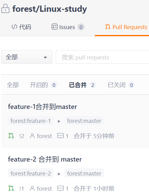(7)将feature-2分支,合并到master分支,在远程上操作。