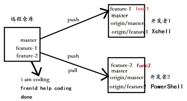 (1)先链接在远程仓库和两个本地仓库的feature-1和feature-2分支。