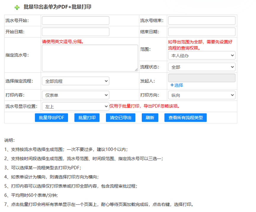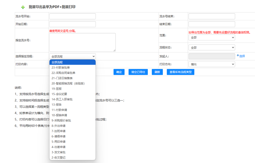 2、有客户要将系统里某一类的审批流程全部导出PDF文件形式存档,一张一张来太麻烦了;