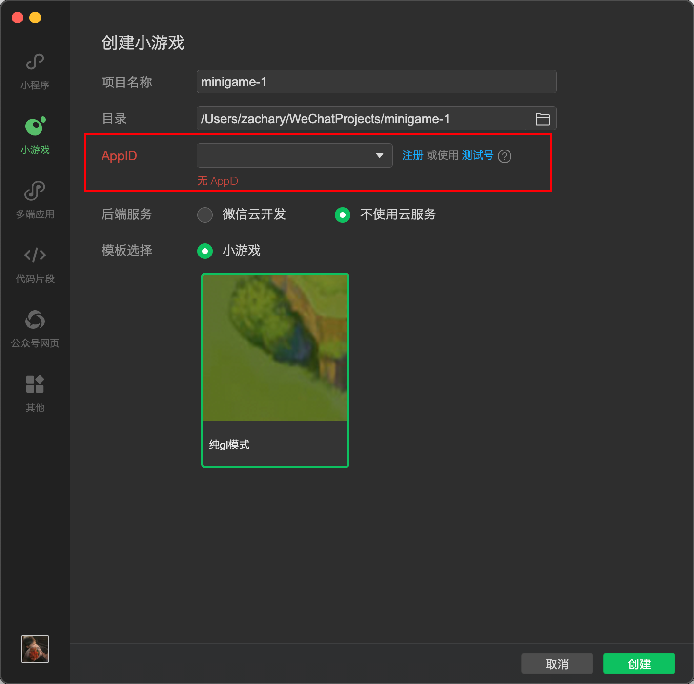 - 项目的.json文件要和开发者页面的一致,否则会无法正确识别,会按照.json文件的id来。微信开发者工具这填的appid字段,需要先在微信小程序页面申请对应的id,分为小程序类 和 游戏类,记得区分哦。