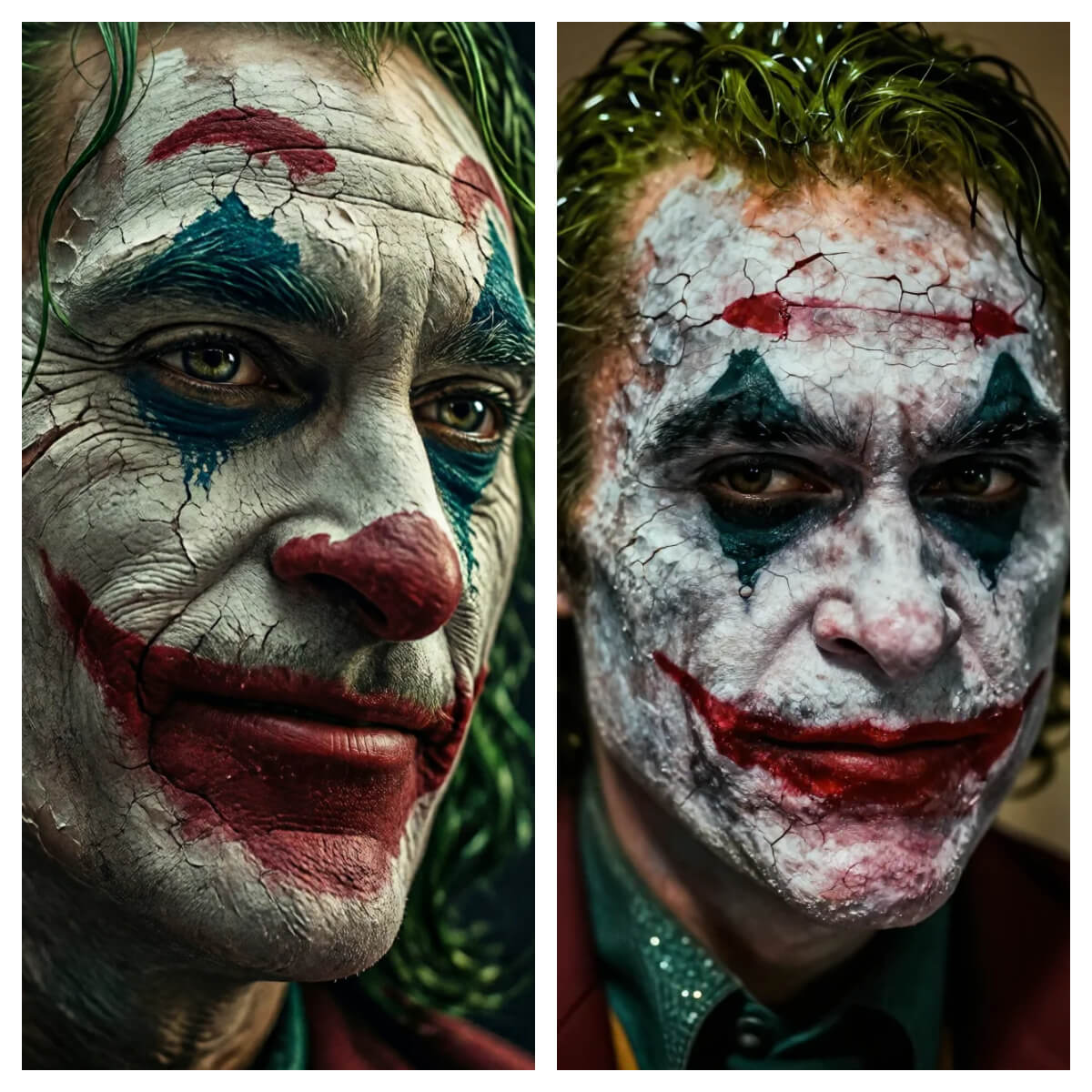 `An ultra-detailed, hyper-realistic extreme close-up portrait of The Joker. The frame is filled with his face in a tense three-quarter profile, capturing a moment of unsettling stillness. His skin is a grotesque canvas: a thick layer of caked, smeared white makeup cracks like dry earth, revealing sallow, scarred skin beneath. Crazed streaks of smudged red lipstick stretch far beyond his lips into a permanent, manic grimace. Toxic green hair, oily and unkempt, frames his face. The eyes are the focal point---hollow, dark-rimmed, and gleaming with a volatile mix of calculated madness and raw, chilling mirth. Every pore, every flake of peeling makeup, and the subtle, menacing tension in his jaw muscles are rendered in microscopic detail. Dramatic, chiaroscuro lighting from a single source casts deep shadows across his features, creating extreme contrast and amplifying the sinister, iconic atmosphere. Shot on a phantom high-speed camera, 8K resolution, with the texture and impact of a key film still from a psychological thriller. `