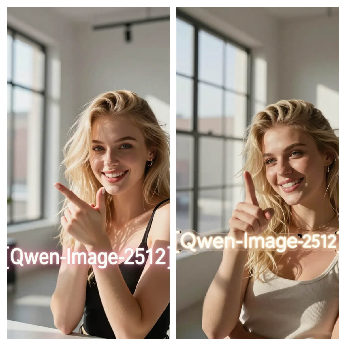 `A stunning, intimate editorial portrait focused on the charismatic face of a 21-year-old blonde social media influencer. She flashes a playful, knowing smile while confidently pointing a manicured finger directly towards the sleek, glowing neon sign bearing the text "[Qwen-Image-2512]". Soft, directional natural light from a large window washes over her, creating a high-contrast interplay of light and shadow that sculpts her flawless features, sparkling eyes, and textured blonde hair. The atmosphere is modern, vibrant, and stylish, with a shallow depth of field that renders the chic, minimalist urban loft background into a soft, creamy bokeh, ensuring all focus remains on her engaging expression and the luminous sign. `