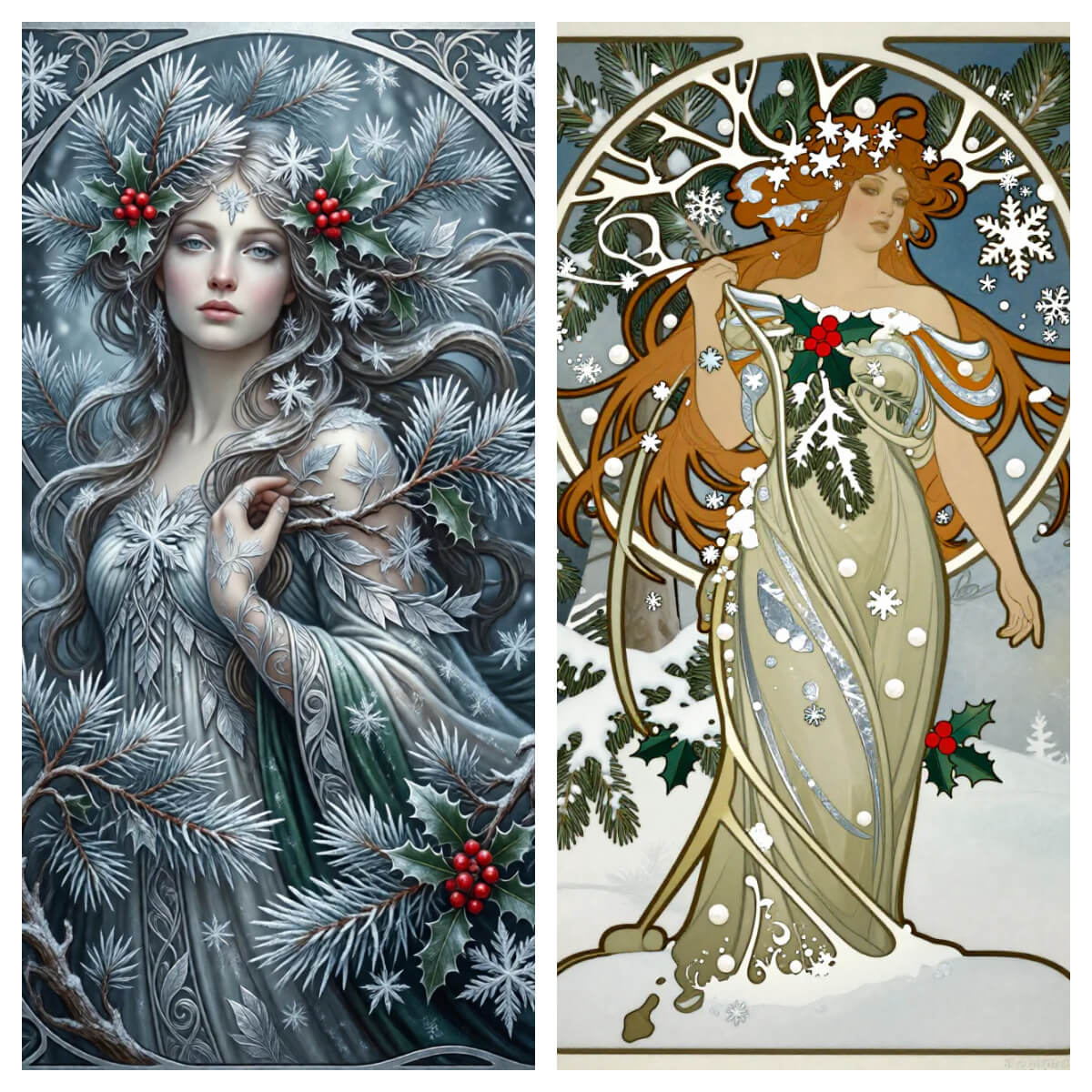 `A graceful Art Nouveau depiction of a "Winter Goddess." Flowing, organic lines frame intricate patterns of frost-kissed pine branches, holly berries, and delicate snowflakes woven into her hair and gown. Silver leaf accents glimmer like ice against a muted wintry palette of frosted blues, deep evergreen, and soft pearl white. In the style of Alphonse Mucha, the composition is highly decorative and ornamental, evoking the serene yet majestic beauty of a snow-blanketed forest. `
