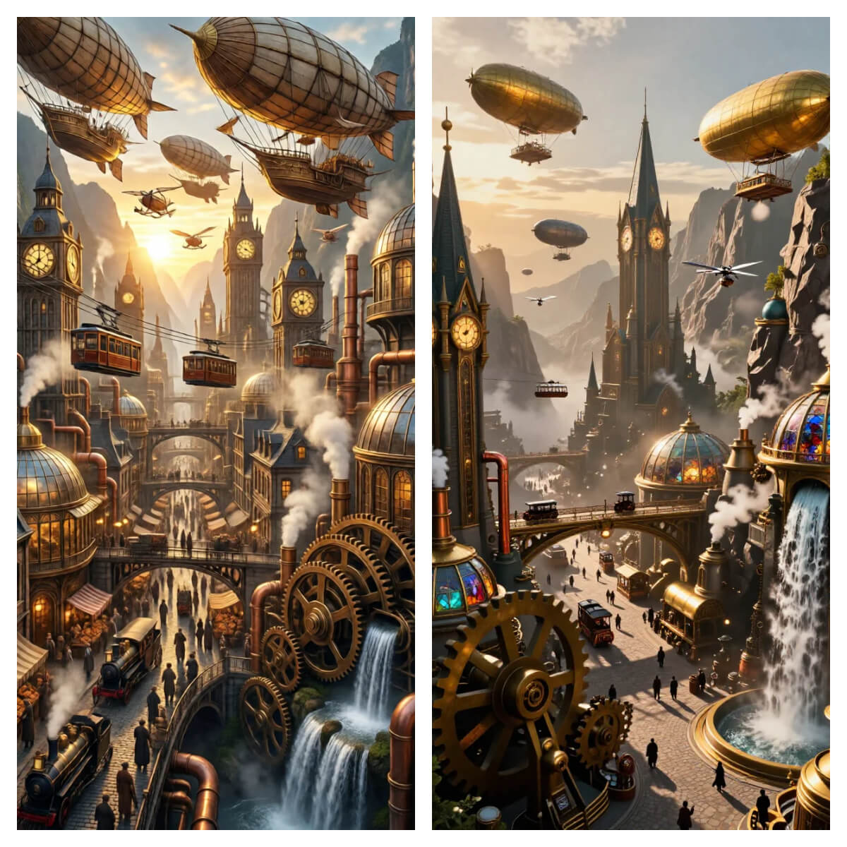 `A breathtaking cinematic masterpiece, ultra-wide panorama of a vast, multi-layered steampunk metropolis nestled within a colossal mountain canyon at sunrise. The city is a vertical labyrinth: towering Neo-Victorian spires with glowing clockwork faces, mid-level residential districts of brass and stained glass connected by buzzing aerial trams, and bustling lower streets where steam-carriages navigate cobblestone roads. The sky is dominated by a fleet of majestic brass-and-wood airships with canvas wings, some docking at skyscraper-sized clockwork towers, others departing alongside smaller personal ornithopters. Countless copper pipes and vents emit plumes of steam, catching the brilliant golden-hour light which creates long, dramatic shadows and glints off countless gears, glass domes, and polished brass. Victorian-clad citizens crowd grand plazas, market stalls, and intricate bridge networks, full of life. In the foreground, a massive, slowly-turning central gear and a cascading waterfall turned into a steam-powered generator add dynamic scale. The atmosphere is thick with hopeful industry, mist, and sunbeams, hyper-detailed, 8K, epic sense of scale and wonder. `