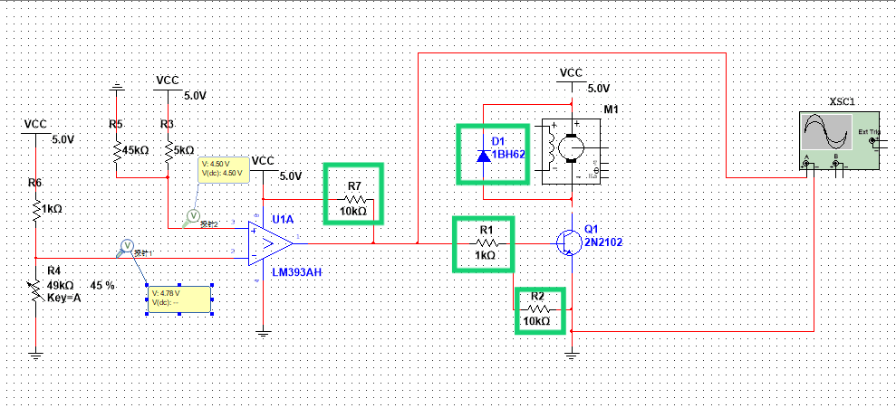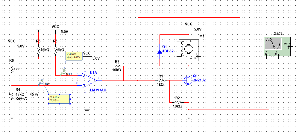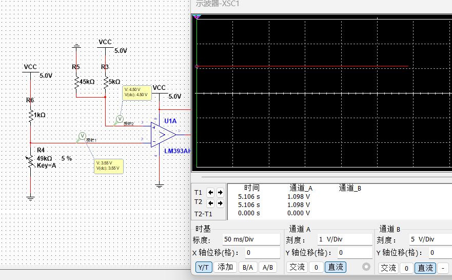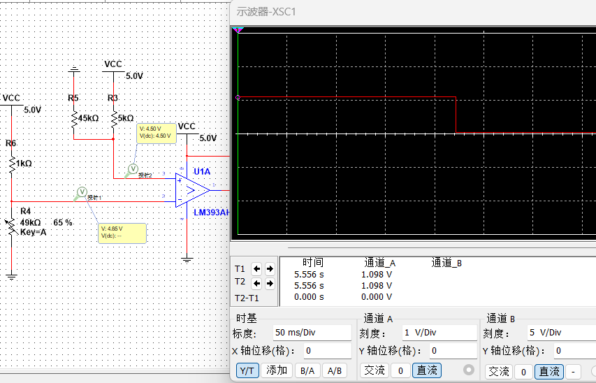 在这里我固定了V+=4.5V,因此调节反相输入端电位计改变其电压即可。