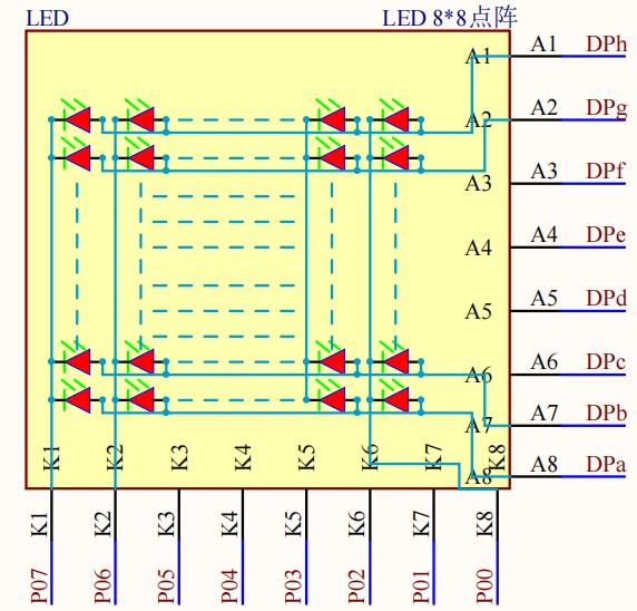 要想控制 LED 点阵, 可以将单片机管脚按照 74HC595 芯片的通信时序要求来传输数据, 这样即可控制 LED 点阵的行数据。 根据 LED 发光二极管导通原理, 当阳极为高电平, 阴极为低电平则点亮, 否则熄灭。 因此通过单片机 P0 口可控制点阵列, 74HC595 可控制点阵行。