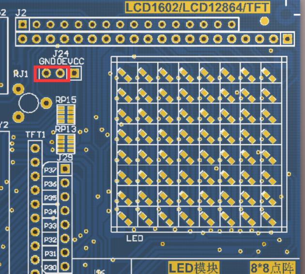 注意事项:LED点阵旁的J24黄色跳线帽短接到GND一端