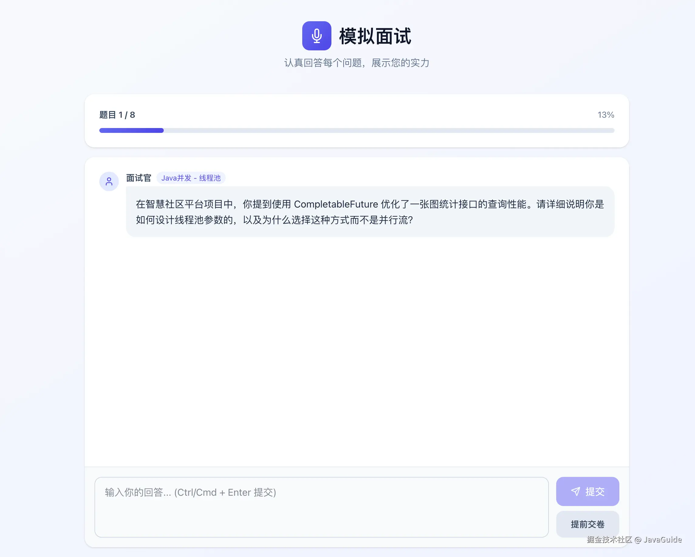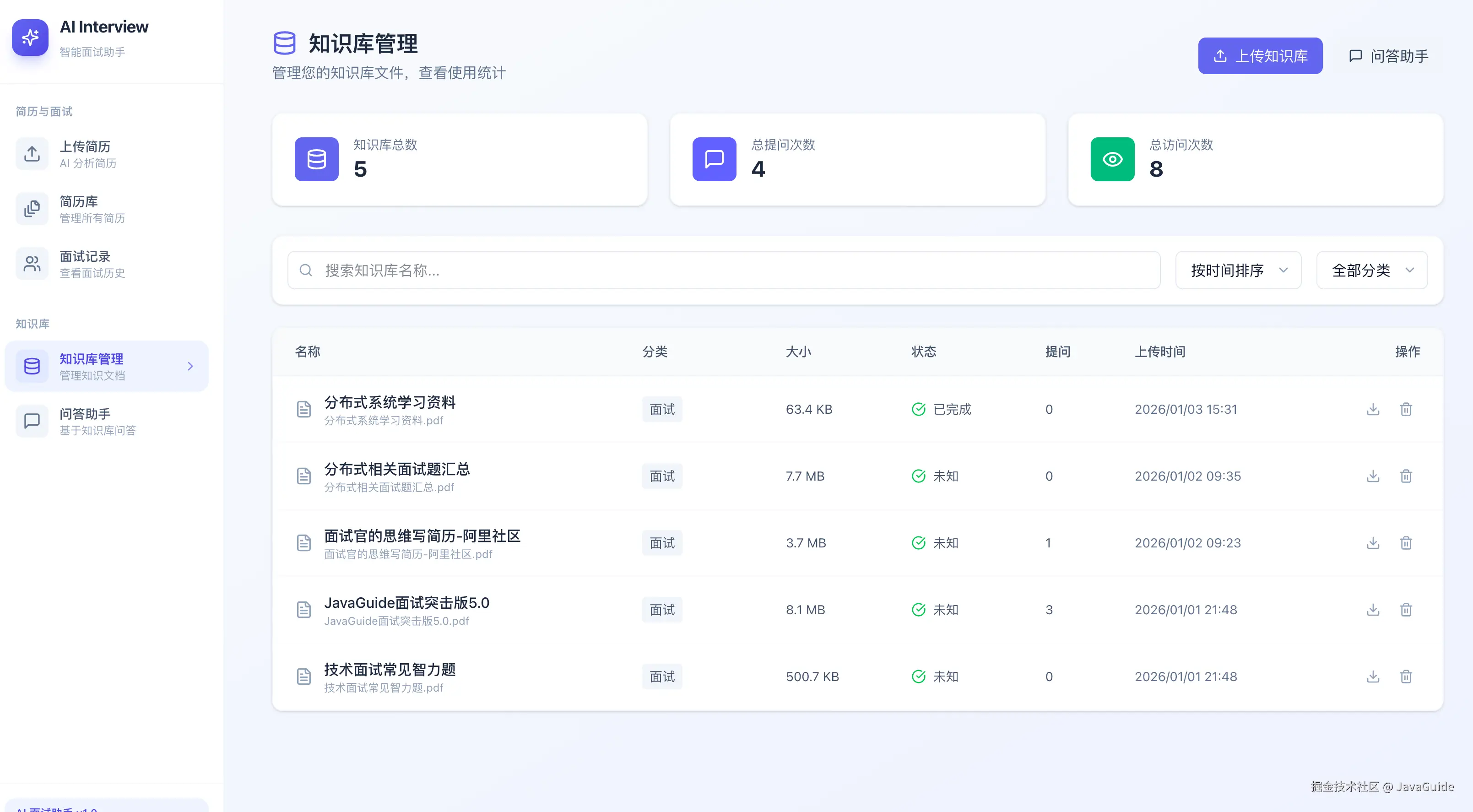 InterviewGuide 是一个集成了简历分析、模拟面试和知识库管理的智能面试辅助平台。系统利用大语言模型(LLM)和向量数据库技术,为求职者和 HR 提供智能化的简历评估和面试练习服务。