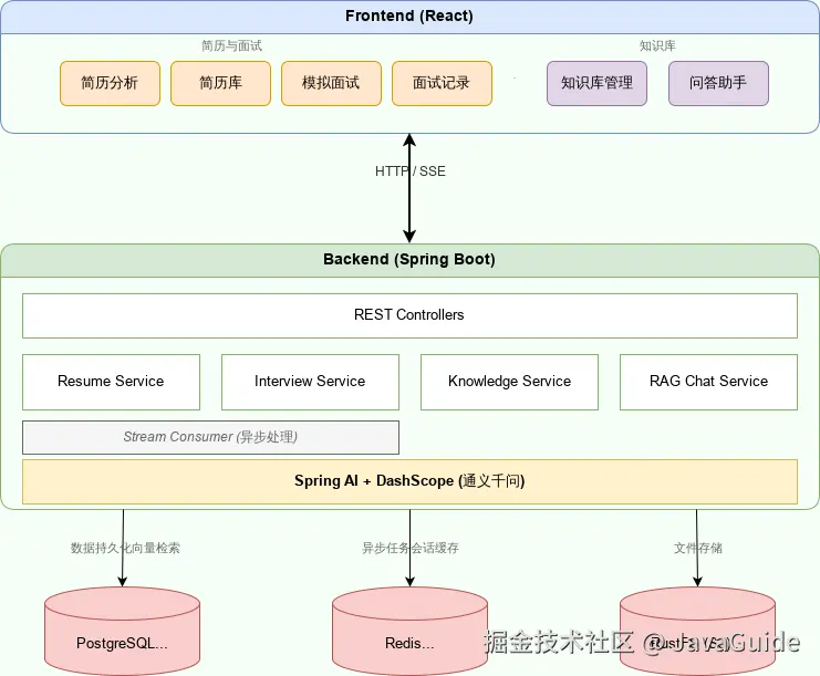 你好,我是 Guide。利用元旦假期,我开源了一个基于 Spring Boot 3.3 + Java 21 + Spring AI + PostgreSQL + pgvector + RustFS + Redis 的大模型项目,实现了简历智能分析、AI 模拟面试、知识库 RAG 检索等核心功能。