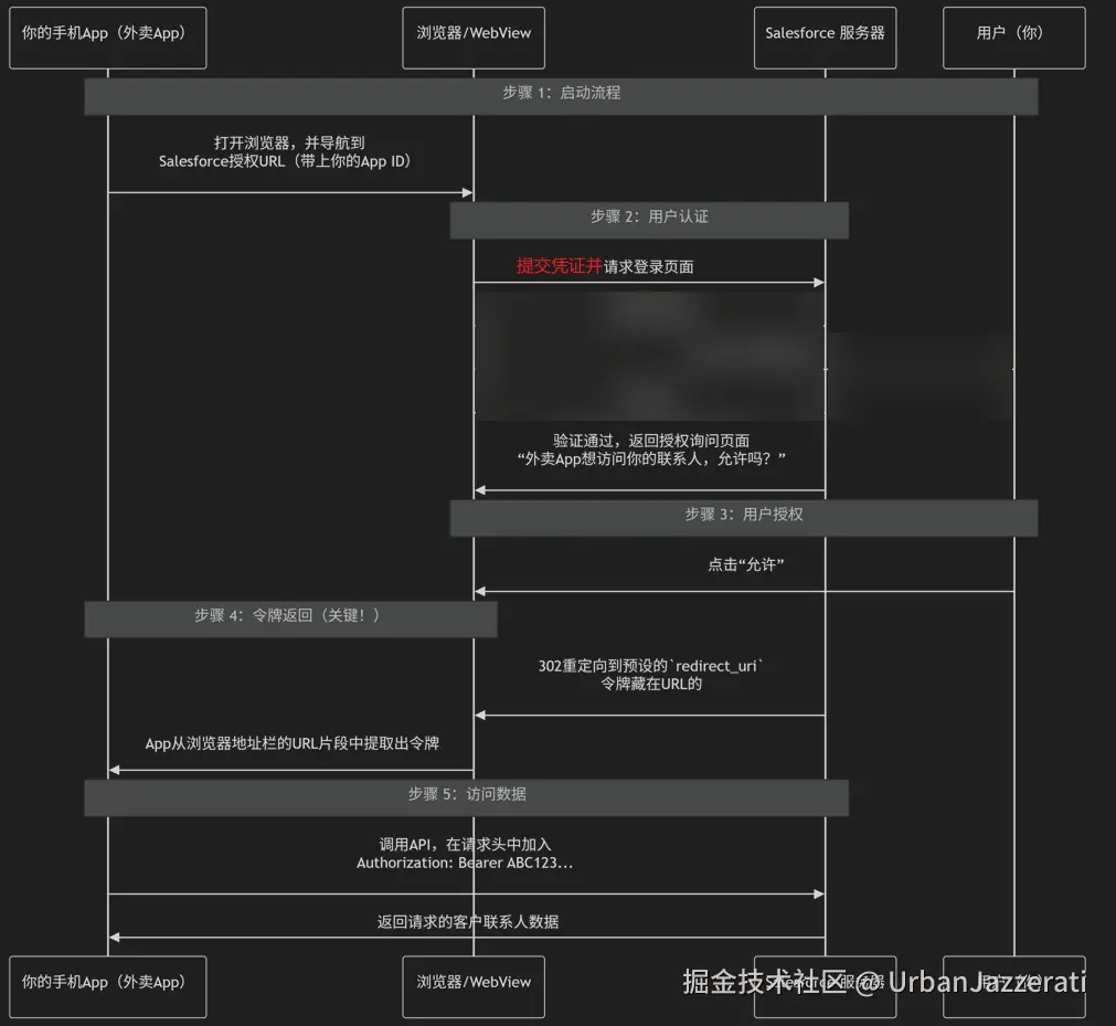 - 重定向至授权 :App打开一个浏览器(或WebView),并将用户重定向到Salesforce的授权端点 (