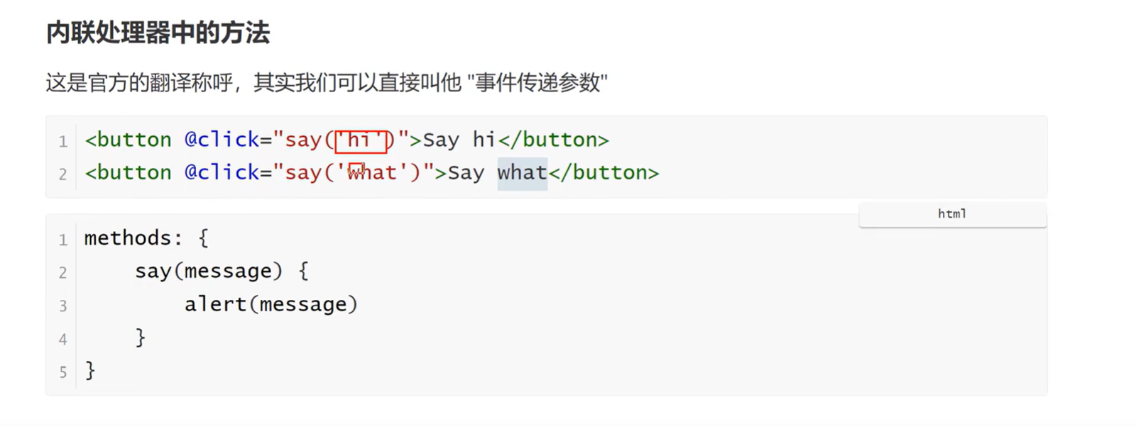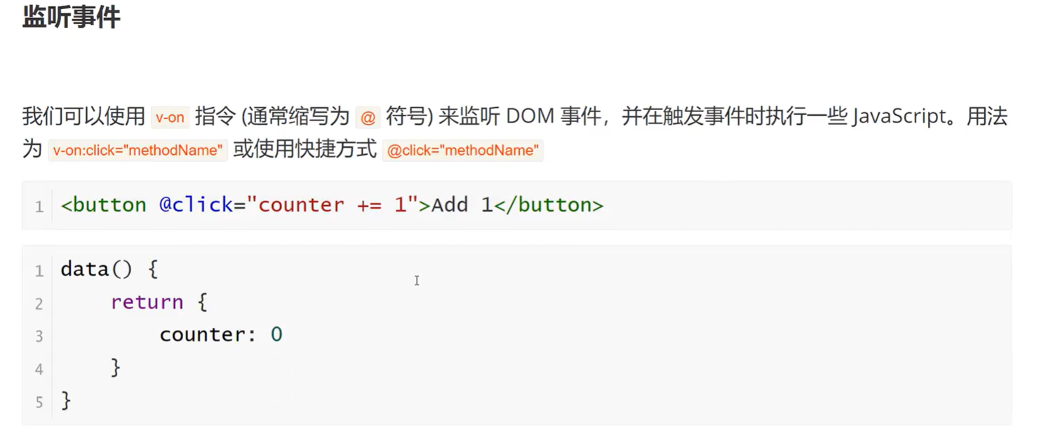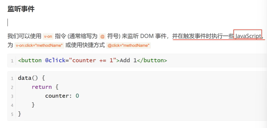 然而许多事件处理逻辑会更为复杂,所以直接把JavaScript 代码写在 von 指令中是不可行的。因此 von以接收一个需要调用的方法名称。