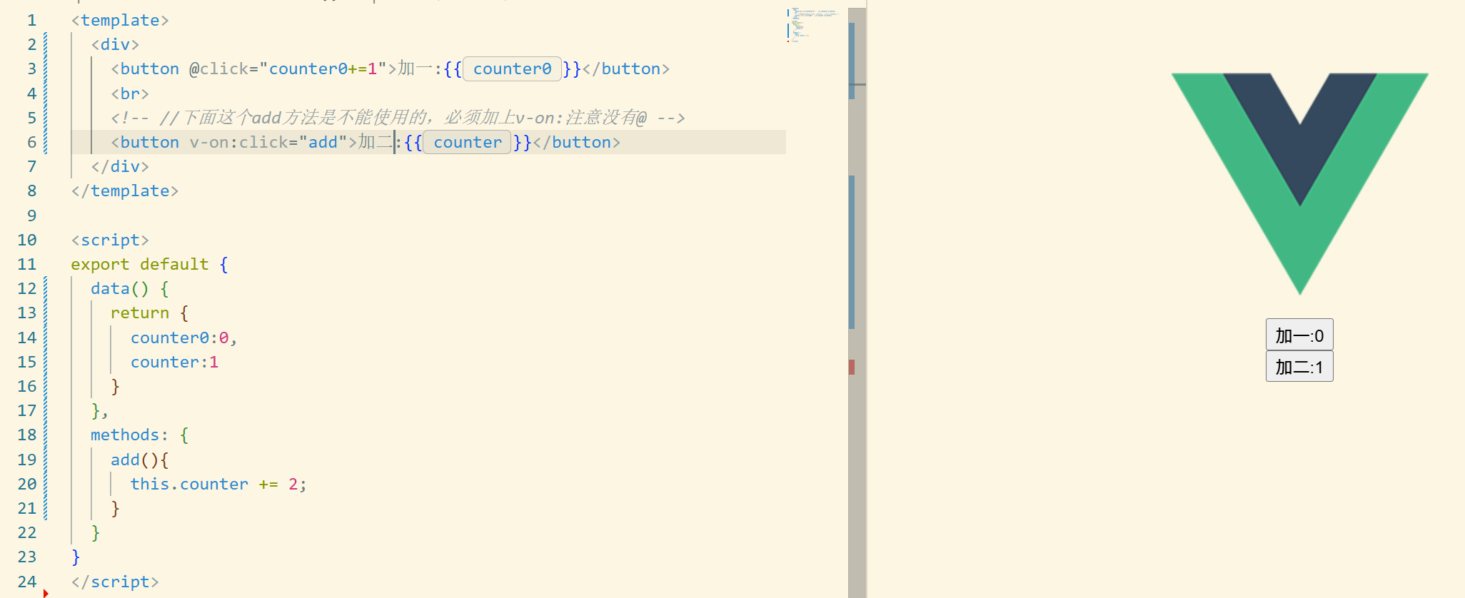 <!-- //下面这个add方法是不能使用的,必须加上v-on:注意没有@ -->