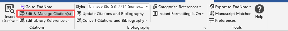 点击 Word 顶部 EndNote X9 选项卡最左侧的 Edit & Manage Citations(编辑和管理引文)按钮。