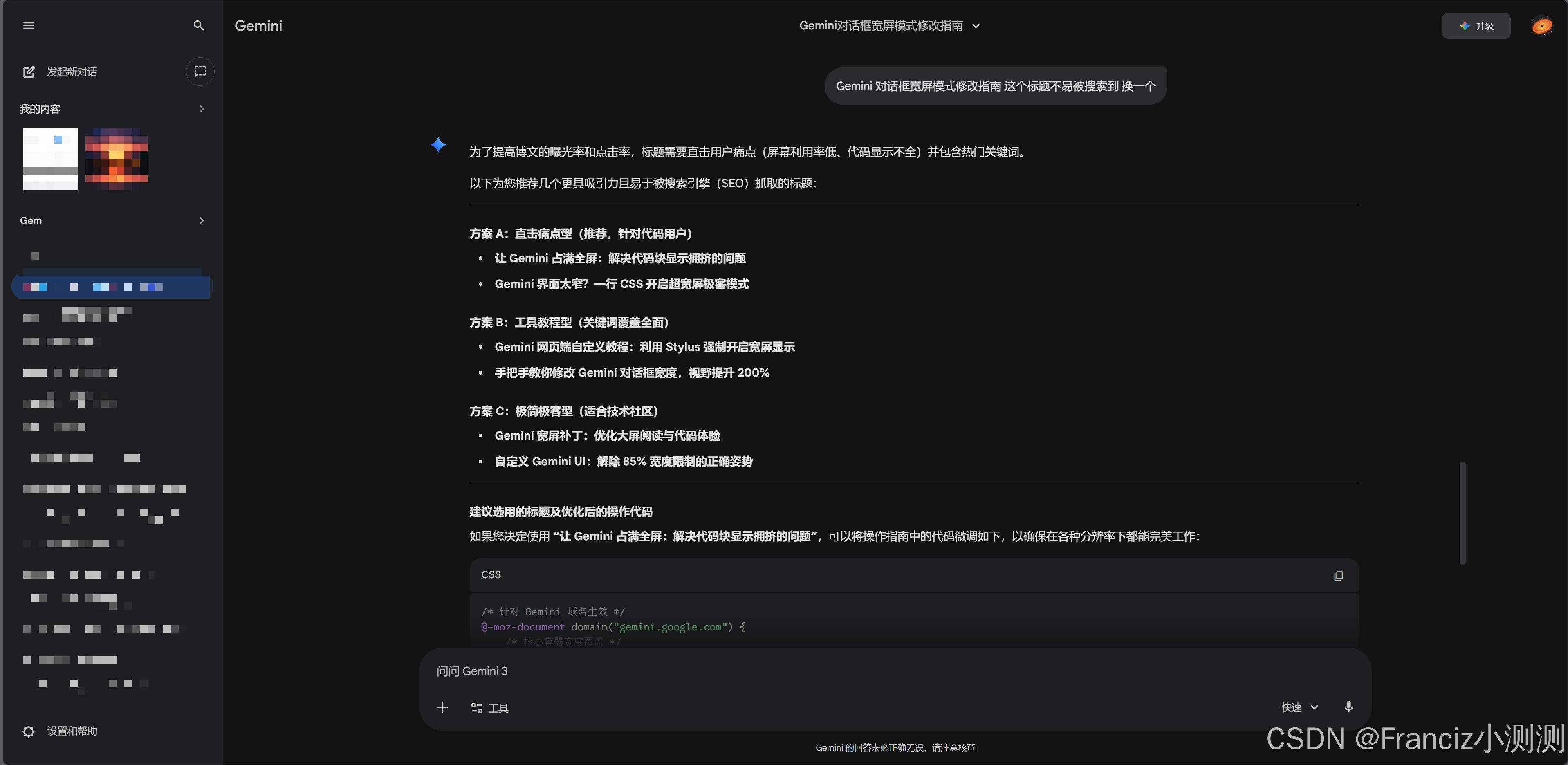 要在 Gemini 中完美应用宽屏样式,通过 Stylus 插件进行定制是最稳定的方案。以下是关于如何操作 Stylus 插件并部署代码的详细步骤。