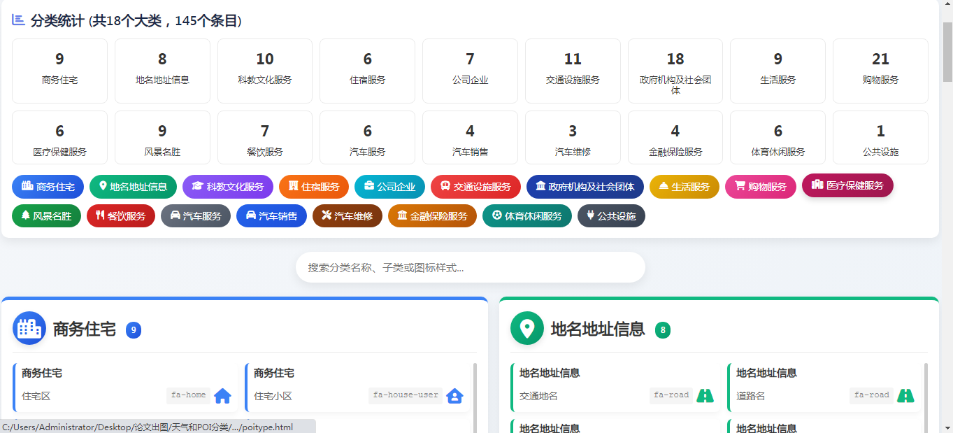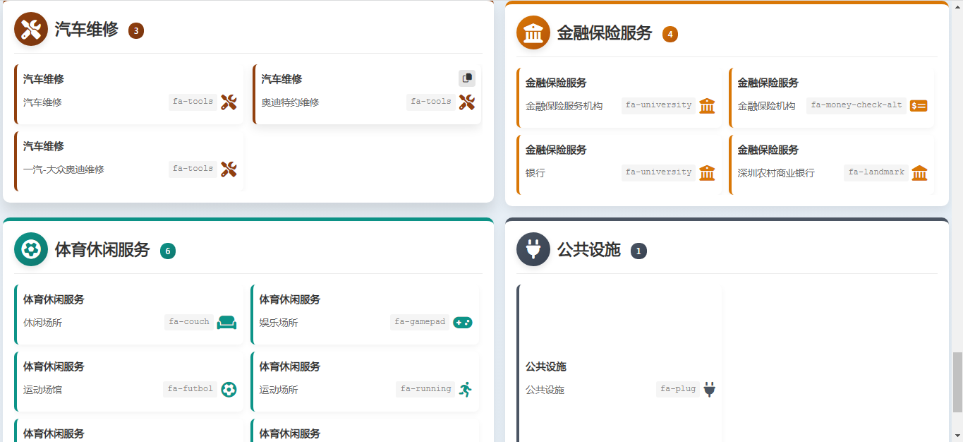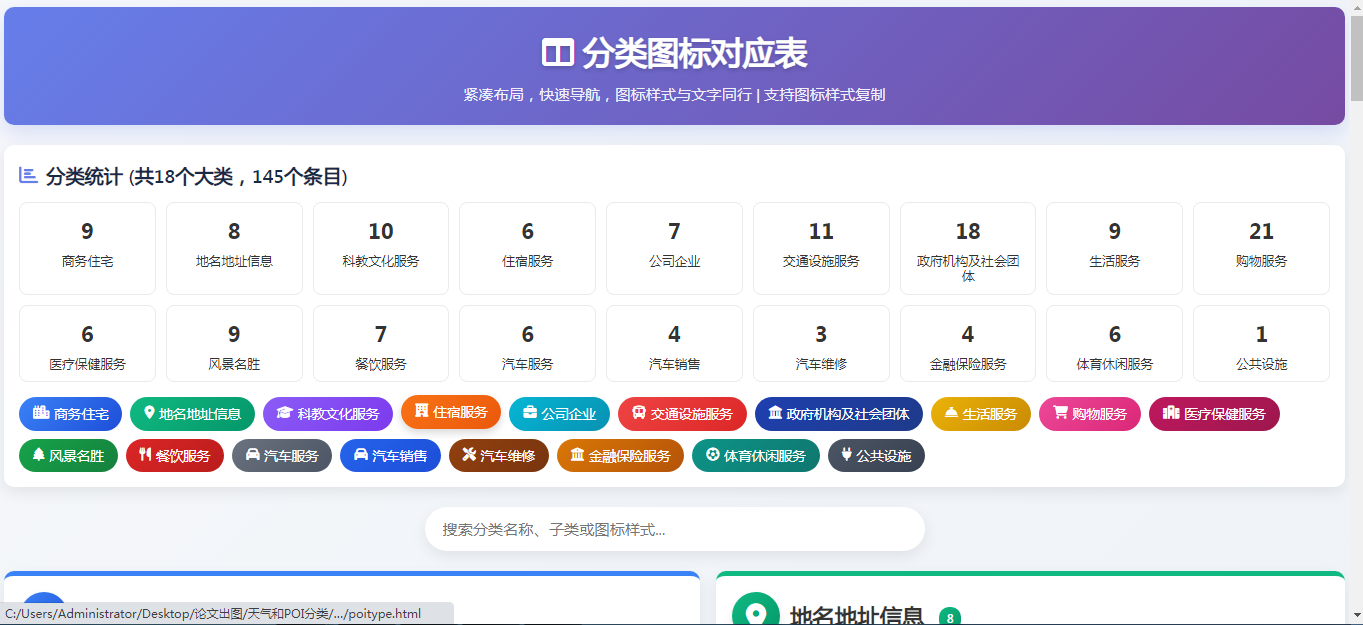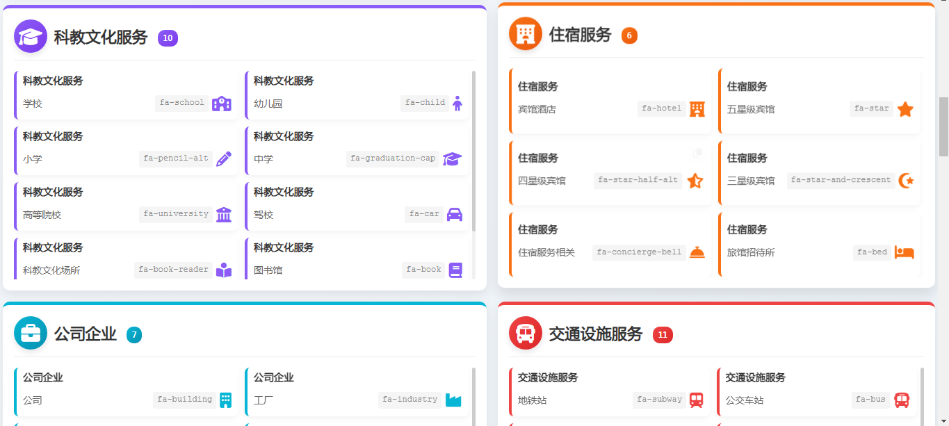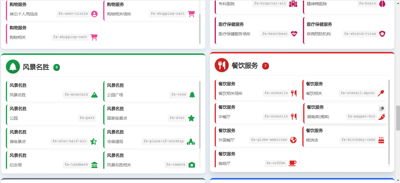 基本都三级的形式进行展示。虽然百度地图和高德地图的POI分类有一些差异,但是两者的大类基本是可以对应上的,因此我们求同存异,可以将相同的分类进行抽取和封装。下面就是对两个在线地图的分类信息进行一个简单的分类,并且对分类后的POI图标进行展示。