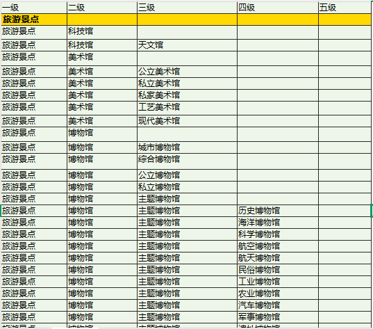 首先我们来看一下百度天地图的POI分类,在百度地图的官方网站地址中可以查看和下载POI分类的内容,这里以我们下载好的POI分类Excel表格,如下图所示: