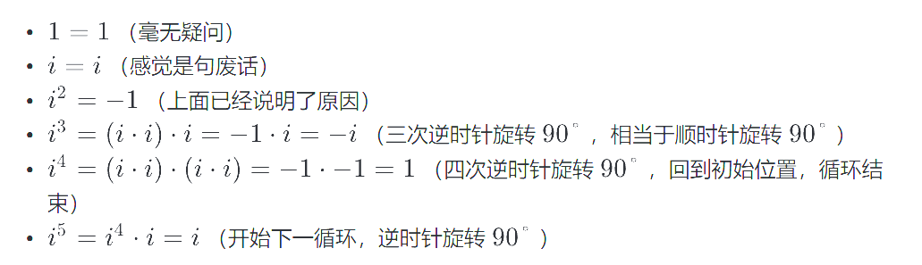 特别的,有些介绍文档中还提到了i的高次方,借助欧拉公式,也就更好理解,每次乘i,相当于逆时针旋转 p i / 2 pi/2 pi/2: