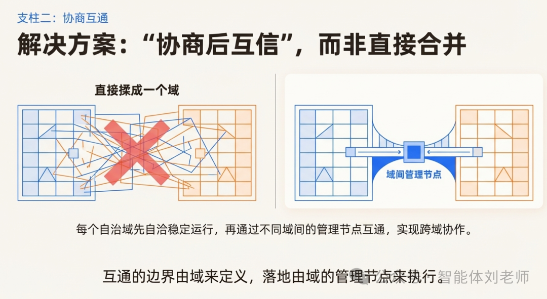 - 互通不是"默认互信",而是"协商后互信"------互通的边界由域来定义,落地由域的管理节点来执行。