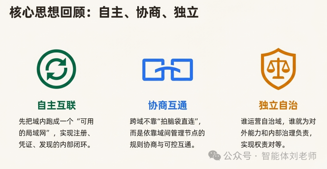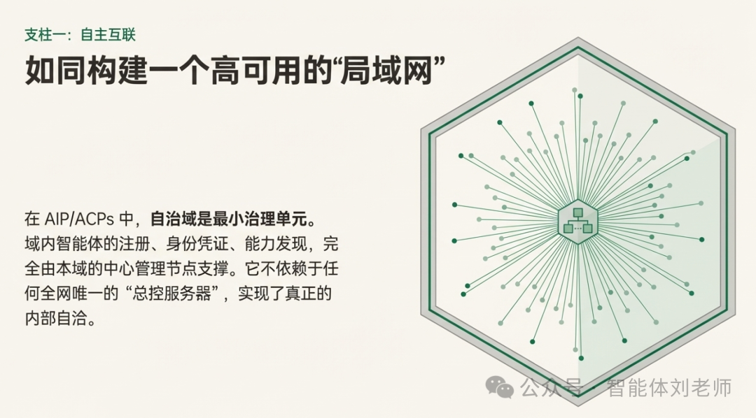 - 域内的智能体注册、身份凭证、能力发现,都由本域的中心管理节点来支撑,而不是依赖全网唯一的某个"总控服务器"。