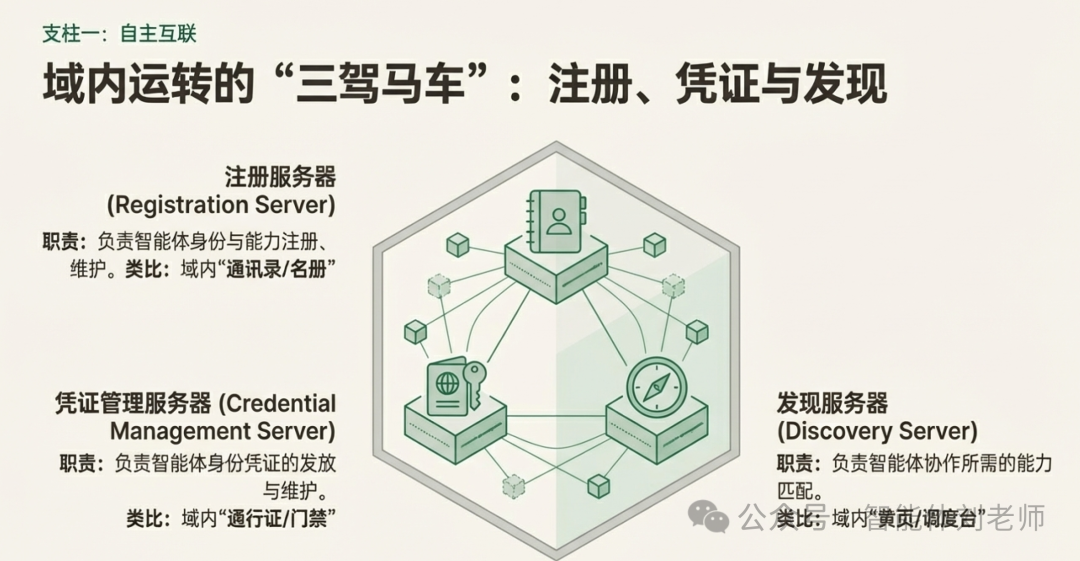 那域内的智能体互联,靠什么"跑起来"?靠每个自治域中的三类关键管理节点分工协作完成:
