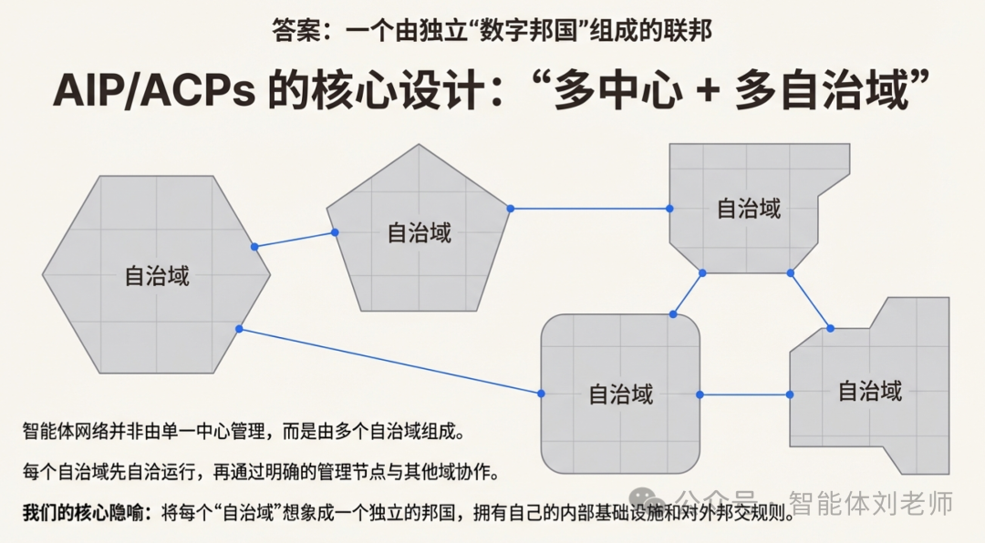 域内先自洽稳定运行:AIP/ACPs采用"多中心 + 多自治域"的形态------一个互联网不是一个中心管到底,而是由多个自治域组成;