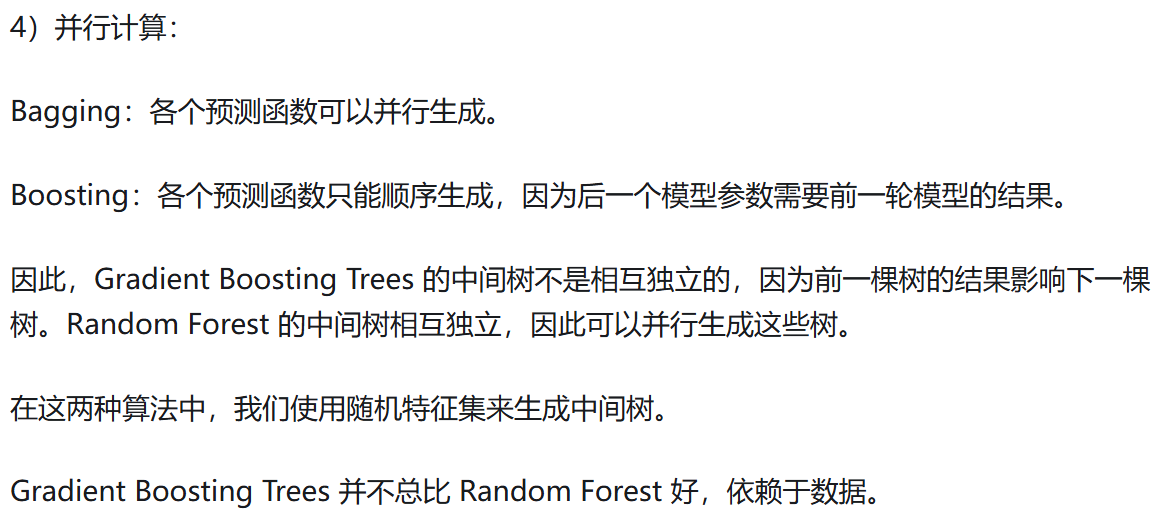 Bagging: 从原始数据集中通过自助采样(Bootstrap sampling) 产生多个子训练集,用每个子训练集独立训练一个基学习器。对于分类问题,对所有基学习器的预测结果进行投票 ;对于回归问题,对所有基学习器的预测结果取平均。