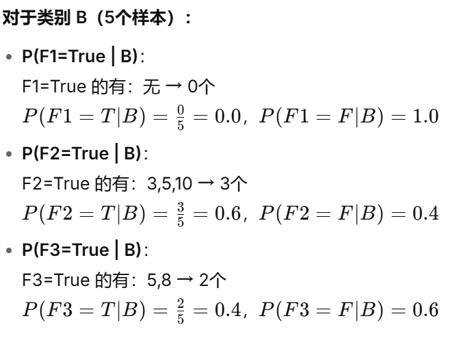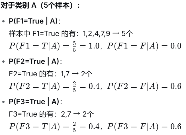 (2)计算各特征在给定类别下的条件概率: