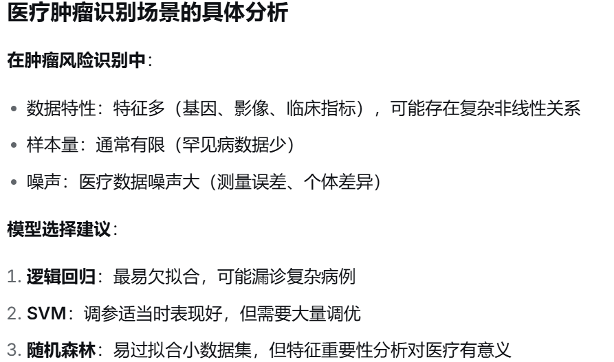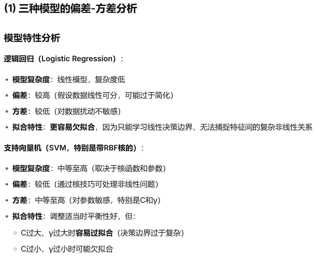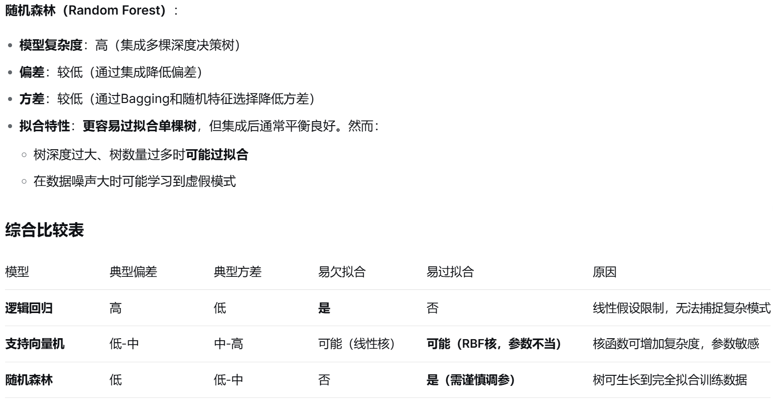 (1) 针对逻辑回归、支持向量机和随机森林三种模型,分析它们的偏差和方差,并分析:哪种模型更容易欠拟合?哪种更容易过拟合?请解释原因。