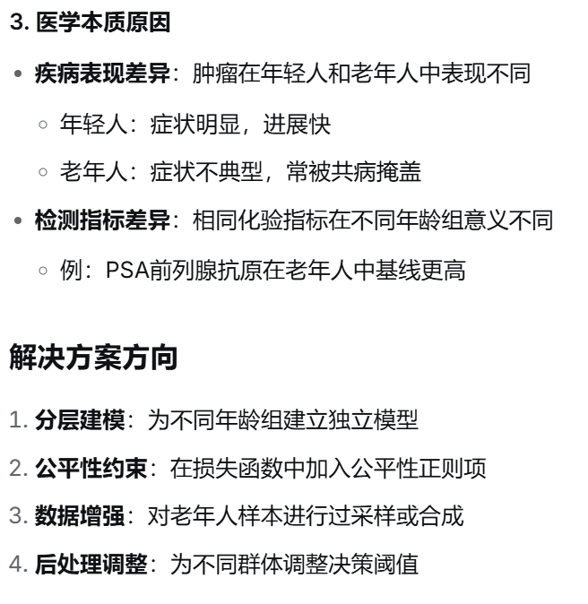 (2) 在模型评估中发现,模型在不同群体上的表现差异显著:在年轻人群体中的准确率达到 90%,而在老年人群体中只有 72%。请问这是机器学习中的什么偏差问题?造成该现象的可能原因有哪些?