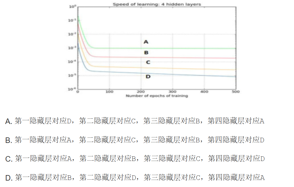 在神经网络反向传播中,梯度从后往前传,梯度不断减小,最后变为零,此时,浅层的神经网络权重得不到更新,那么前面隐藏层的学习速率低于后面隐藏层的学习速率,即随着隐藏层数目的增加,分类准确率反而下降了。这种现象叫做梯度消失。梯度消失导致后层的权重更新的快,靠近输出层的权值更新相对正常,前层网络由于梯度传递不过去得不到更新。因此,靠近输入层的更新会变得很慢,导致靠近输入层的隐藏层权值几乎不变,接近于初始化的权值。这样在网络很深的时候,学习的速度很慢或者无法学习。D的学习速率最慢,因此是第一隐藏层。