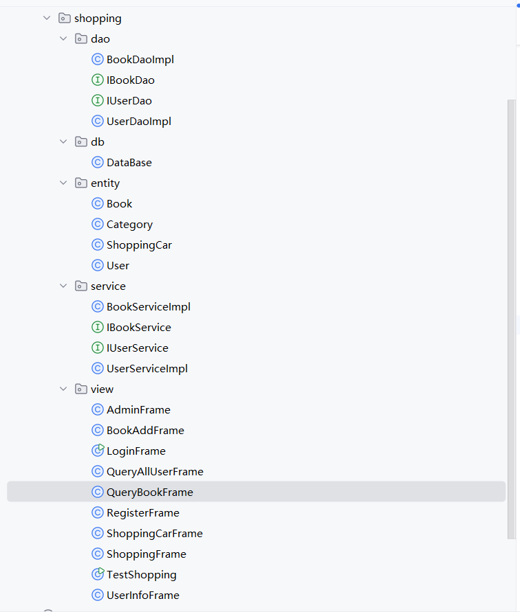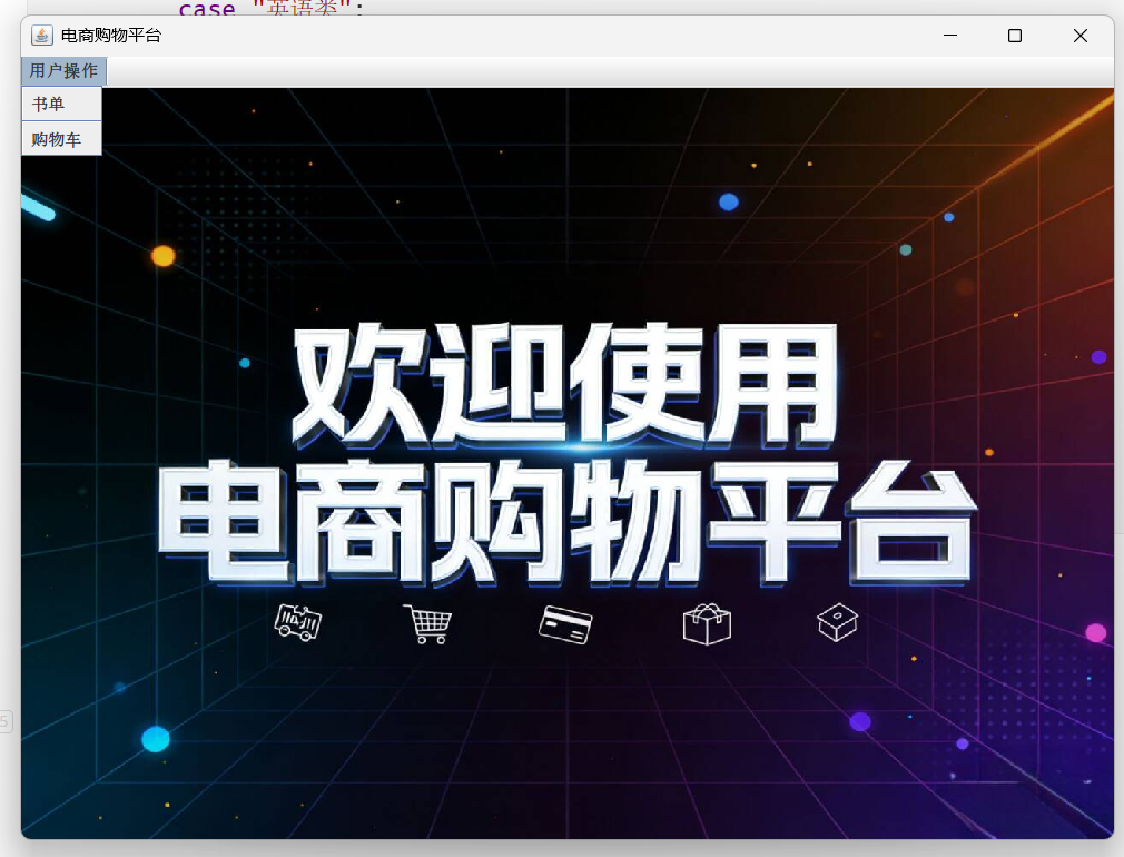 ShoppingCarFramejavapublic ShoppingCarFrame() { setTitle("电商购物平台------用户购物车"); setSize(800, 600); setLocationRelativeTo(null); setResizable(true); setDefaultCloseOperation(JFrame.DISPOSE_ON_CLOSE); // 不要 EXIT_ON_CLOSE,避免关闭整个程序 getContentPane().setBackground(Color.WHITE); init(); setVisible(true); } -