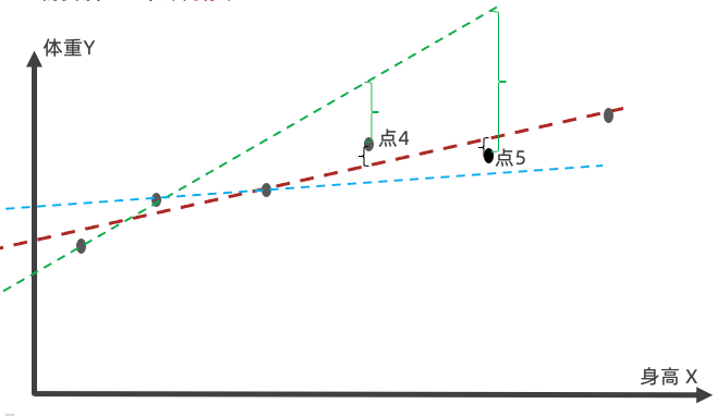 "红色直线能更好的拟合所有点"也就是误差最小,误差和最小