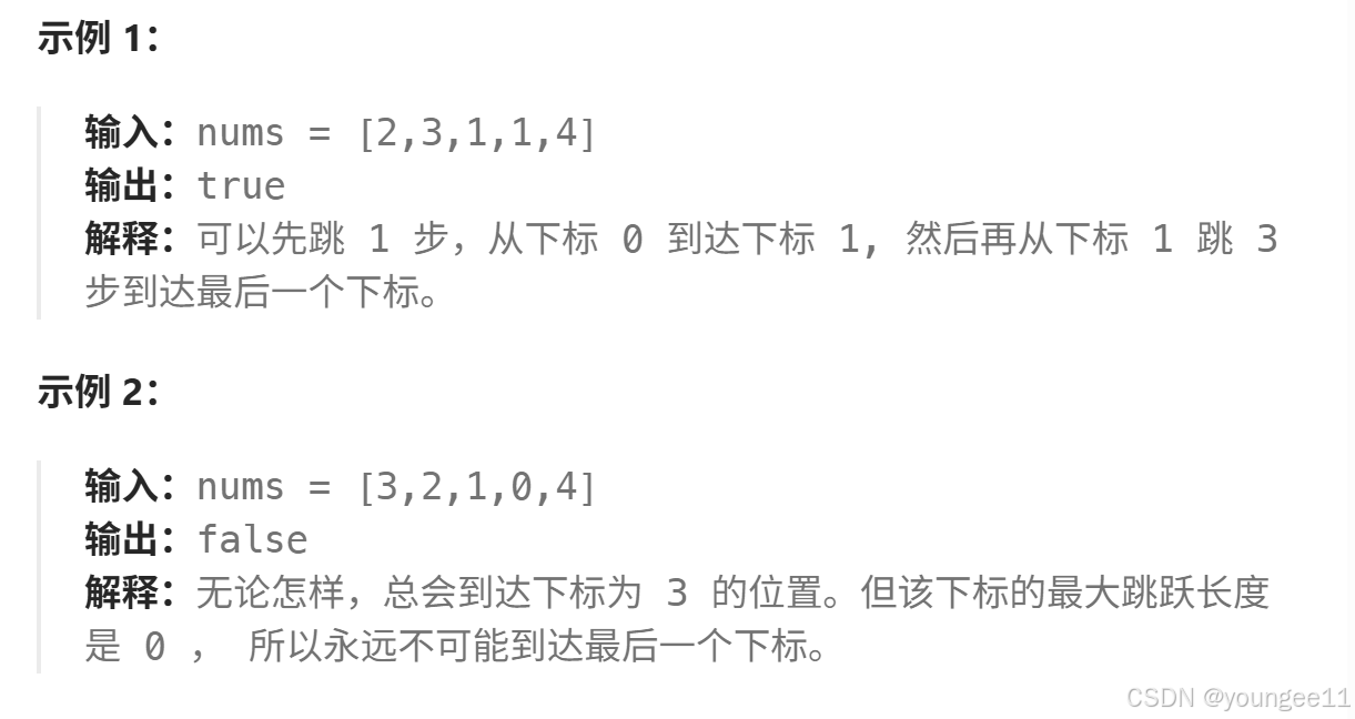 给定一个非负数数组nums,最初位于数组的第一个下标。数组中的每个元素代表在该位置可以跳跃的最大长度。判断是否可以到达最后一个下标,如果可以,返回true,否则返回false。