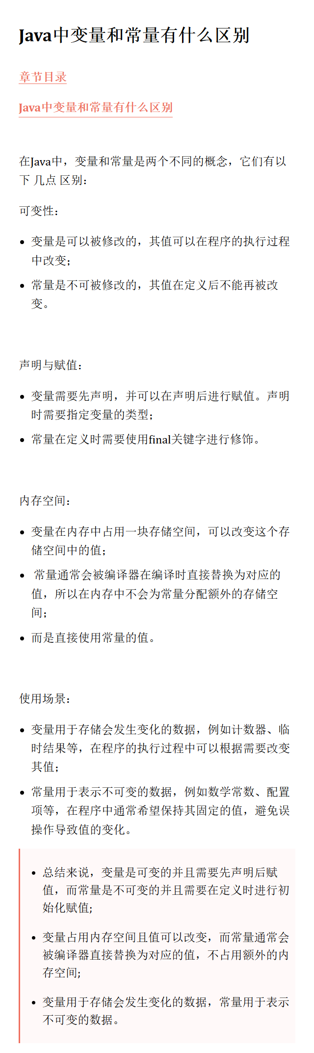 - 总结来说,变量是可变的并且需要先声明后赋值,而常量是不可变的并且需要在定义时进行初始化赋值;