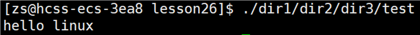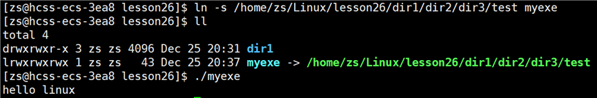 为什么要有软链接?在一般写项目时,项目中的文件是很多的。在 lesson26 文件下建立一串目录dir1/dir2/dir3,在 dir3 中建立 test.c 文件,文件中写入打印 "hello linux" 的代码,编译 test.c 形成可执行程序 test。如果我想要在 lesson26 目录下执行可执行程序 test,那么就需要写 test 所处的绝对或相对路径: