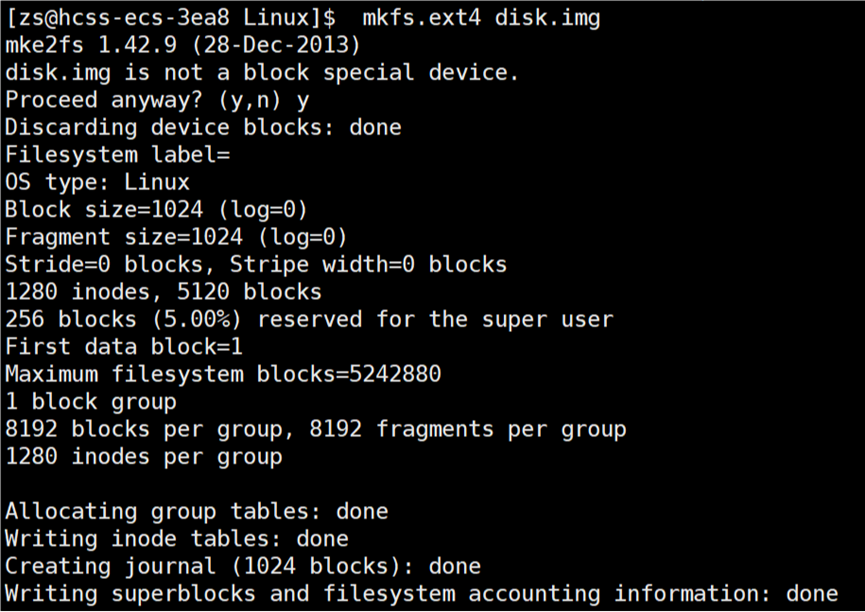 可以将disk.img理解成一个小分区,现在这个分区不能直接被使用,需要格式化。怎么格式化?向分区中写入文件系统。格式化命令:mkfs.ext4 disk.img(ext2,ext3,ext4的文件系统是一样的)