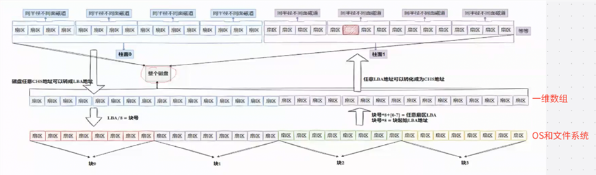 磁盘就是一个三维数组,我们把它看成一个"一维数组",数组下标就是 LBA,每个元素都是扇区,每个扇区都有 LBA,那么8个扇区一个块,每一个块的地址我们也能算出来。