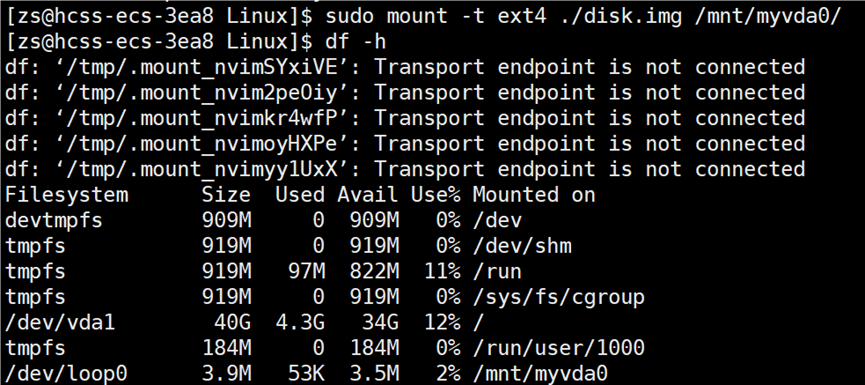 指定目录创建完毕之后,将 disk.img 挂载到该目录下,使用指令:sudo mount -t ext4 ./disk.img /mnt/myvda0/,将分区挂载到指定的目录。